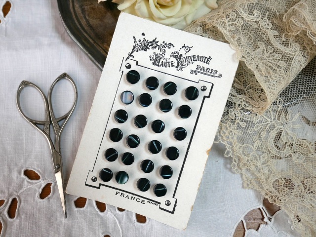 フランスから届いた1900年代のマザーオブパールボタンシートです。ネコ目のようなデザインの小さなダークグリーンカラーの光沢のあるきれいなマザーオブパール(貝の内側の真珠層)の丸ボタンが24個、素敵なデザインの紙製シートにセットされています。シートには、経年による汚れ等ありますが、ボタンは光沢がありコンディションは良いです。 *フランス シート紙製 貝製ボタン *サイズ ボタン 直径約0.8cm シート 縦約10.9cmX横約7.3cm