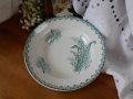 フランスから届いたSaint Amand の人気のすずらんデザインのスープ皿です。1900~1930年代のフランスSaint Amand (サンタマン)窯の人気シリーズ「MUGUET」すずらんの絵柄が素敵な深皿です。実用品として使われていたものか経年による細かなキズが多くあります。他汚れや製造工程で釉薬の中に入り込んだとみられる異物やくぼみ等あり、裏のロゴマークのミス。全体的なコンディションは悪くありません。細かい状態はお写真でご確認下さい。実用品として、ディスプレイにもいかがでしょうか。 *フランス製 *サイズ 直径約22.5cmX高さ約3.4cm