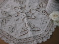 フランスから届いたアンティークのハンドメイドカットワークドイリーです。1900年代頃のハンドメイドのお品で八角形のリネン生地にちょうちょの細やかなカットワーク刺繍が施されふちにはボビンレースがあしらわれています。ポツポツと小さなシミ汚れ、一部補修されたあとがありますが、経年による生地の傷みも少なくコンディションは大変良いです。実用品としてもお使い頂けます。 *フランス *サイズ 約40cmX約40cm