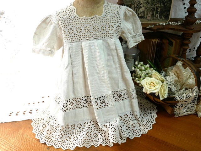 フランスから届いたアンティークカットワークレース&コーデュロイベビーワンピースです。1900年代から1910年代のホワイトカラーのコットンコールデュロイ生地にホワイトコットンカットワークレースがふんだんに使われた切り替えしのデザインがとても素敵な手の込んだベビーワンピースです。背中の部分に小さな3個のシェルボタンがついています。経年による汚れ、シミ等多少ありますが、生地のダメージが少なく全体的な保存状態は良いです。実用品としてもお使いいただけそうです。一度お洗濯済みです。ご希望があれば追加の画像をお送りさせて頂きます。 *フランス製 *サイズ(平置寸法)・・・着丈46cm、肩幅 21 cm、 身幅28cm、首周り36cm、袖口周り18cm