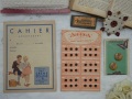 フランスから届いたアンティークやブロカントのメルスリーアイテムを5点セットにしました。 当店通常販売合計価格7,680円のところ36%引きの4,900円とお得なプライスにて販売させて頂きます。◆1930~40年代のフランスの靴墨メーカーの広告の入った可愛らしいデザインのノートで、中は罫線が引かれていてホチキスで一ヶ所綴じられています。デッドストックの未使用のお品で経年による色褪せは少しありますが、傷みや汚れも少なくコンディションは良好です。実品としても十分お使い頂けます。*サイズ 約19.5cmX約14.4cm ◆1930年代の小さなブラックのスナップボタンが36個、アプリコットピンクのシンプルなデザインの紙製シートにセットされています。デッドストックのお品物で、経年による汚れ、傷み等少なく、コンディションは良いです。 *サイズ ボタン 直径約0.7cm シート 縦約17cmX横約11cm ◆丸形のナチュラルウッドにお花のハンドペイントが施されたボタンが2個、グリーン系の蝶のイラストが入ったデザインの紙製シートにセットされています。シートは、経年による汚れ等ありますが、ボタンは汚れ、傷みが少なくコンディションは良いです。 *サイズ ボタン 直径約2.1cm シート 縦約10cmX横約7cm ◆ベルギー製でボルドーとゴールドの星形デザインの厚手の紙製台紙に100番手のホワイトリネン糸が巻いてあります。40mと書いてありますがいくらか使用されているようです。台紙は経年による傷み汚れ等少ないですが、糸は経年による汚れがあります。 *サイズ 直径約8cm(一番大きいところで) ◆馬車の絵柄がデザインされた素敵なオレンジのラベル付きブラック紙製ケースに縫い針が7本入ったセットです。針はNo 6/10の細目です。錆があり実用に向きませんが、ケースはきれいな状態で全体的なコンディションは良いです。 *サイズ 約7cmX約3.1cm