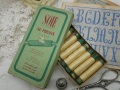 フランスから届いたアンティークのボックス入りの小さなシルク糸巻きセットです。1920~30年代のもので筒状に丸めた紙にイエローカラーのミシンや手縫い用のシルク糸が8本専用のボックスに収められています。本来は10本入りですが8本入っています。ほとんどが未使用に近い状態です。経年による汚れ、ボックスの傷みが多少ありますが、コンディションは良いです。糸は実用品としてもお使い頂けます。 *フランス *サイズ ボックス約13cmX約6.5cmX約1.6cm 糸巻き各約5.5cmX直径約1.1cm