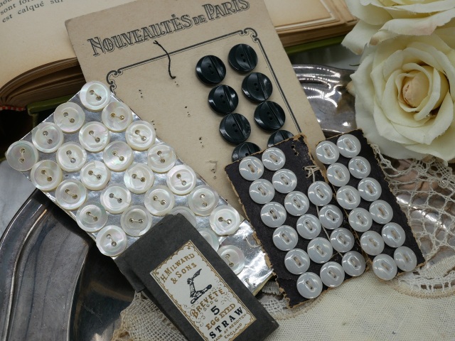 フランスから届いたブロカントのシェルボタン、ガラスボタンや樹脂ボタンのシート、ニードルのメルスリーアイテムを4点セットにしました。おそらく1930~40年代頃のシェルボタンやガラスボタン、プラスチックボタンのシートを3点とイギリス製ニードルセット1点の4点をセットにしてお得なプライスにて販売させて頂きます。それぞれ経年による傷みや汚れがありますが、全体的なコンディションは悪くありません。実品としても十分お使い頂けます。 *サイズ Aシート...約12.0cmX約8.0cm、ボタン 直径約12cmX12個 Bシート...約10.2cmX約4.6cm、ボタン 直径約1.1cmX31個 Cシート...約6.3cmX約5.8cm、ボタン 直径約0.9cmX34個 ニードル...約5.6cmX約2.7cm