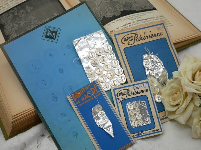 フランスから届いたブロカントのシェルボタンシートなどの5点セットにしました。おそらく1930代頃の小さなシェルボタンのシートを3点とマザーオブパールボタンのシート1点、使用済みのボタンシートのみ1点の計5点をセットにしてお得なプライスにて販売させて頂きます。それぞれ経年による傷みや汚れがありますが、全体的なコンディションは悪くありません。実品としても十分お使い頂けます。 *サイズ Aシート...約19.5cmX約13.3cm、 Bシート...約13.4cmX約8.5cm、ボタン 直径約1.1cmX3個 Cシート...約7.1cmX約5.1cm、ボタン 直径約0.7cmX8個 Dシート...約9.3cmX約4.5cm、ボタン 直径約0.9cmX2個 Eシート...約8.0cmX約4.6cm、ボタン 直径約1.15cmX18個