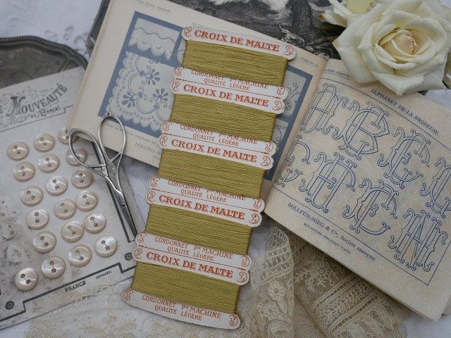 パリの蚤の市で出会った紙製台紙シルク糸巻きです。アイボリーカラーのマルタ十字のデザイン紙製台紙に光沢のあるイエローグリーンのミシン用のシルク糸が巻いてあります。1920年代のデッドストックのお品です。糸は少し汚れのようなものが見受けられますが、経年による傷み汚れ等少なく保存状態は良いです。実用品としてもお使いいただけそうです。  *フランス  サイズ 縦約17.3cmx横約7.2cm
