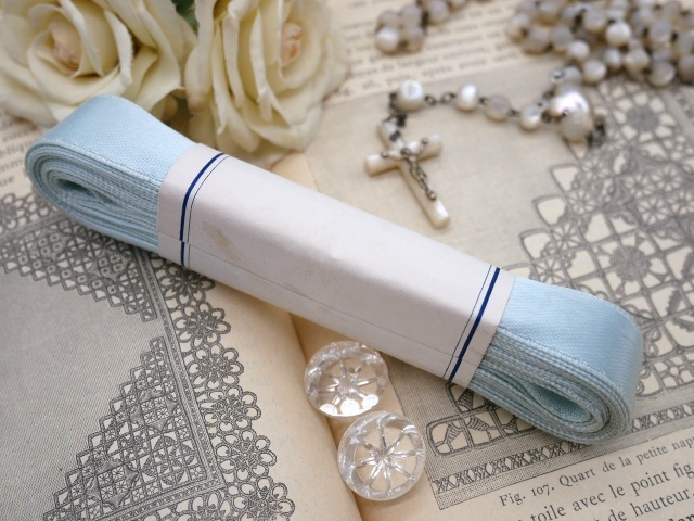 フランスから届いた淡いブルーのサテンリボンです。光沢のある上品な水色のしっかりとしたサテン素材の未使用品デッドストックの帯付き巻きリボンです。経年による汚れ、傷みがありますコンディションは悪くありません。実用品としてもお使いいただけますが、雰囲気のある素敵な巻きリボンですディスプレイとしてもいかがでしょうか。 *フランス *サイズ 巻き状態約13.2cmX厚み約2.5cm リボンの幅約1.9cm