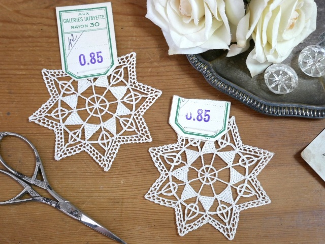 フランスから届いたタグ付きのモチーフレースです。1893年創業のPARISの老舗のデパート AUX GALERIES LAFAYETTE(ギャラリーラファイエット)のタグ付きの小さな星型のモチーフレース2点セットです。ひとつは残念ながらタグが半分に切り取られています。経年による汚れ、傷み等少しありますが、コンディションは良いです。ディスプレイとしても実用品として作品のポイントにお使い頂いても素敵ですね。 *フランス  *サイズ  モチーフ直径約7.0cm タグ約3.0cmX約4.3cm