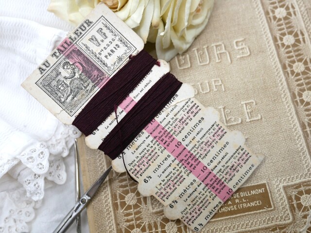 フランスから届いたアンティークのVF社製紙製台紙シルク糸巻きです。1880年代パリのV.F社製の仕立て屋やテーラーの縫製用のシルク糸が巻かれた糸巻きです。職人が洋服を仕立てているイラストデザインの台紙に光沢のある上質な赤みのあるブラウンカラーの細めのシルク糸が巻いてあります。残念ながら大半の糸が使用されてシートもカットされています。経年による傷み、汚れが少なく全体的なコンディションは悪くありません。 *フランス サイズ 縦約11.9cmx横約6cm