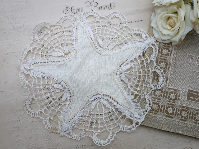 フランスから届いたアンティークのハンドメイドリネンボビンレースドイリーです。19世紀後期のエクリュカラー星形のリネン生地の周囲にル・ピュイボビンレースが施されたハンドメイドの素敵なラウンドドイリーです。経年による生地の汚れがありますが、傷みが少なくコンディションは良いです。実用品としてもお使い頂けます。 *フランス *サイズ 直径約19cm(ハンドメイドの為きれいなラウンド型ではありません)