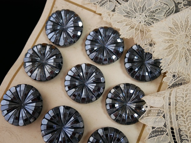 フランスヴィンテージブラックガラス放射状カットデザインボタン(直径2.7cm)
