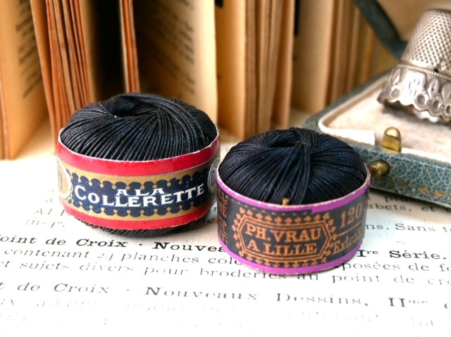 フランスから届いたケース入りブラックリネンボビン2点セットです。小さいボビンは18~19世紀にフランスで流行したシノワズリー(中国様式)のデザインで120番のブラックカラーの上質のリネン糸巻き、大きなボビンもおそらく同じPH Vrau社のものかと思われ40番の上質ブラックリネン糸巻きです。どちらもほぼ未使用に近い状態でラベルもきれいに残っており全体的なコンディションは良好です。 *フランス *サイズ 直径約3.2cmX約2.1cm 直径約2.9cmX約1.9cm