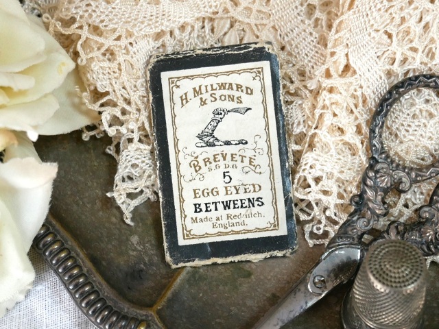 フランスから届いたイギリス H.Milward&Sons社製アンティークニードルです。1730年に設立されたイギリスのH.Milward&Sons社製のフランスで販売されていたニードルです。こちらのEGG EYED BETWEENS は仕立て用やキルティングなど細かな作業に適した身近な針で卵型の針孔に通しやすい作られた針です。おそらく19世紀後期のものかと思われます。素敵なデザインの紙製ケースを開くと中には手芸用の針が9本残っています。経年による傷み、汚れ、サビ等ありますが全体的なコンディションは悪くありません。実用には向きませんが素敵なデザインのニードルケースですコレクションの1つとしてもいかがでしょうか。 *サイズ 約4.4cmX約2.7cm