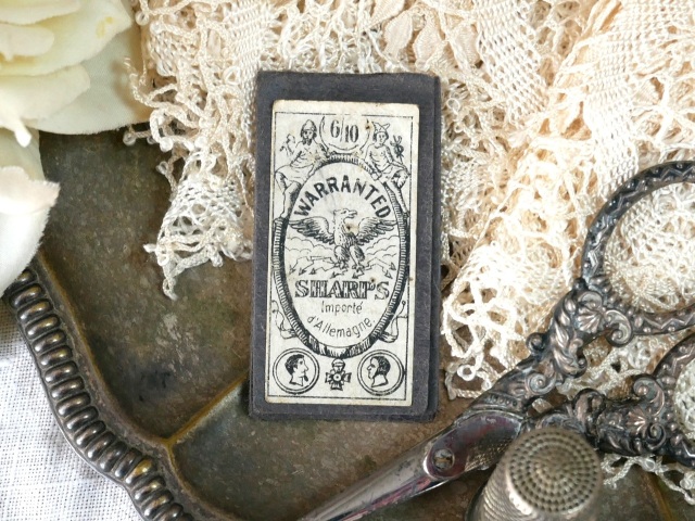 フランスから届いたドイツ製のアンティークニードルです。ブラックカラーの小さなケースに鷲の紋章がデザインされた素敵なラベル貼られています。フランスで販売されていたドイツ製の手芸用の針です。おそらく19世紀後期から20世紀初頭のものと思われます。ケースを開くと中には小さな縫い針が10本残っています。経年による傷み、汚れ、針のサビ等ありますが全体的なコンディションは悪くありません。素敵なデザインのニードルケースですコレクションの1つとしてもいかがでしょうか。   *サイズ 約4.3cmX約2.3cm