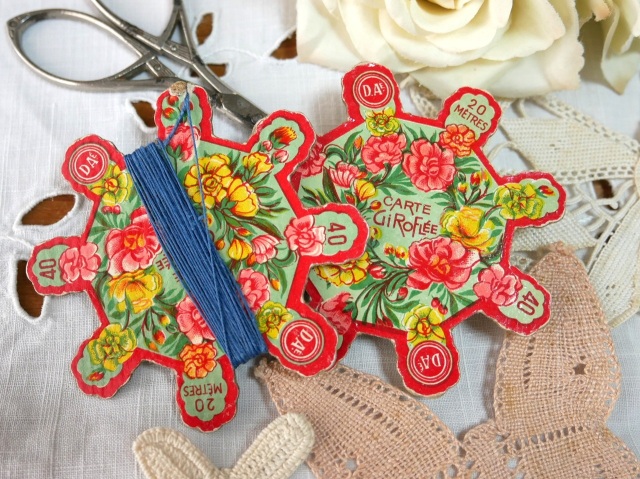フランスから届いた紙製台紙リネン糸巻き2点セットです。1900年代のピンクとイエローの華やかなお花のイラストがとても素敵な紙製台紙のみ1点とブルーグレイカラーのリネン糸が巻いてある1点の2点セットです。40番手の糸巻きですが糸の大半は使用されています。台紙、糸ともに経年による汚れ傷みは多少ありますが保存状態は悪くありません。 *フランス サイズ 各直径約6.8cm