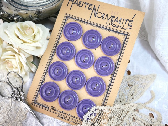 フランスから届いたヴィンテージのガラリスボタンです。おそらく1920~30年代の大きな少し透け感のあるきれいな菫色のガラリス製(牛乳材料のカゼイン樹脂)ボタンです。シンプルなデザインの丸形のボタンです。経年による汚れはありますが、傷みは少なくデッドストックのお品でコンディションは良いです。ボタン1個の価格です。 *フランス ガラリス(カゼイン)製 *サイズ 直径約2.7cmX厚み約0.3cm