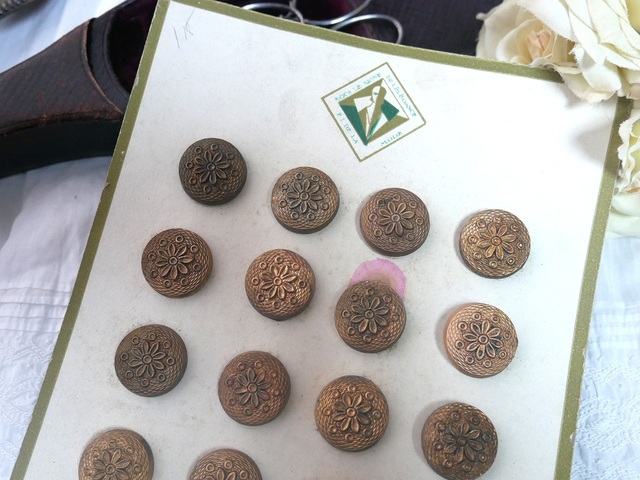 フランスから届いたヴィンテージのメタル調樹脂ボタンです。樹脂製のお花もレリーフが施された足つきボタンにアンティークゴールドカラーの着色が施されたメタル調の素敵なボタンです。おそらく素材はガラリス製(牛乳材料のカゼイン樹脂)と思われます。経年による汚れはありますが、傷みは少なくデッドストックのお品でコンディションは良いです。ボタン1個の価格です。 ※それぞれお色目に違いがありますこれもヴィンテージボタンの魅力とご理解ください。   *フランス  ガラリス(カゼイン)製  *サイズ 直径約1.8cmX厚み約0.9cm(足部分含む)