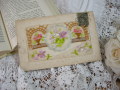 パリの蚤の市で出会ったビオラ刺繍のポケットポストカードです。ビオラとピンクの小花の刺繍が施されたオーガンジー生地のポケットの中に小さなエンボス加工のカードが収められています。ミニカードにはお誕生日をお祝いするメッセージが書かれてあります。カードはエンボス加工のバラのお花がデザインされた大変手の込んだ素敵なポストカードです。切手、消印が入っていますが年代不明です。おそらく1900年頃のものと思われます。経年による汚れが多くありますが紙部分の傷みは少ないです。オーガンジー部分は一部角にホールがありますが刺繍はきれいな状態です。保存状態は悪くありません。 *フランス *サイズ 約13.9cmX約8.9cm