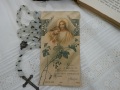 フランスから届いたアンティークHoly Card・プルミエール コミュニオンです。1905年にカトリック教会で、初めて聖体を拝領した記念のカードです。表は、キリストと植物の絵柄がデザインされた素敵なホーリーカードです。裏は、初聖体を受けた子供の名前、教会名、日付が入っています。経年によるが汚れ、傷みが少なく、コンィデションは良好です。 *フランス サイズ 約11.2cmX約6.2cm