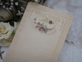 フランスから届いたアンティーク白鳩とバラのレターペーパーです。1890年代の未使用品の便箋で中央上部に2人のエンジェルと細やかな透かし模様のデザインが施され、その上に白鳩とバラのクロモスが貼られいます。縁にも美しいエンボス加工が施されたレースペーパーで縁取られた贅沢で貴重なレターペーパーです。二つ折りで表と裏部分には薄っすら罫線が引かれています。経年による変色や点状の小さな茶色いシミがいくつかありますが、未使用品でコンディションは良好です。実用品としても十分お使い頂けます。便箋1枚の価格です。 *フランス  *サイズ  約20.8cmX約13.5cm
