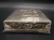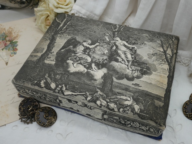 フランスから届いたアンティークマルキーズ ド セヴィニエ ショコラシルクボックスです。1898年創業のパリの老舗高級ショコラメーカーA La Marquise de Sevigne の1900年代初頭のチョコレートが納められていたお箱です。箱上部は、セバスチャン・ルクレール作の冬の田園風景が描かれた美しいシルク生地でキルティングされています。箱下部は、しっかりした厚手の紙製で高級感のある深いブルーカラーにイエローとゴールドの豪華な装飾が箱上部の内側、箱下部の底まで施されれブランドロゴがデザインされた大変素敵なボックスです。箱の底の中央部分が写真ではわかりずらいひずみがあります。経年による上部のシルク生地の汚れやお箱の角や底の部分に傷み、色褪せなどありますが大きな破損等少なくコンディションは良いです。 大きめのお箱なのでメルスリーボックスやアクセサリーボックスとしてお使いいただいても素敵ですね♪ *フランス 紙製箱 サイズ 上部約22.5cmX約17cm,底部分約23.3cmX約17.2cm,全体の厚み約4.2cm