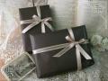 シックなマットブラウンの包装紙に美しく艶のある上質なライトブラウンのサテンリボンをおかけしてラッピングさせて頂きます。